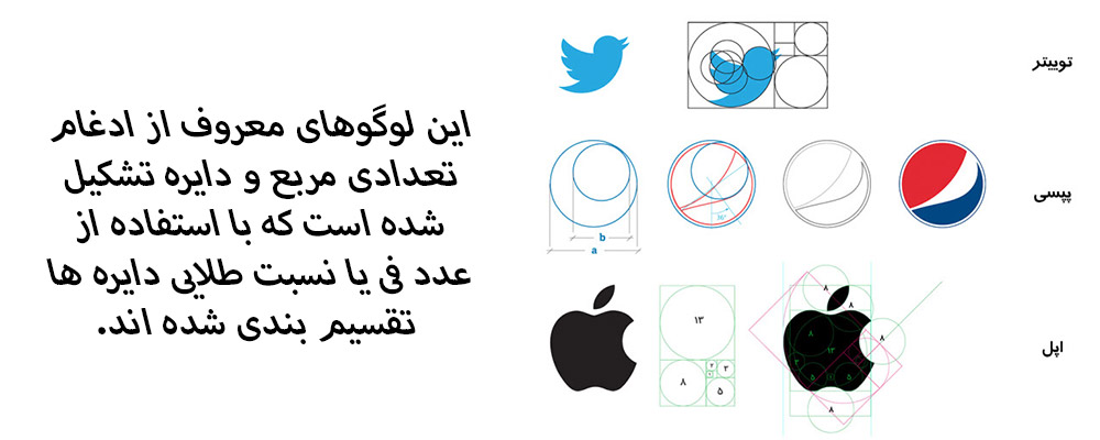 نسبت طلایی تا آنجا مورد توجه کمپانی های بزرگ قرار دارد که بسیاری از آنان در طراحی لگو و هویت سازی برند خود از این نسبت طلایی نیز بهره می برند. برای مثال کمپانی های بزرگی نظیر اپل (Apple)، پپسی (Pepsi) و توییتر (Twitter) را در تصویر زیر مشاهده می کنید که چگونه از نسبت طلایی برای طراحی لگوی خود استفاده کرده اند.