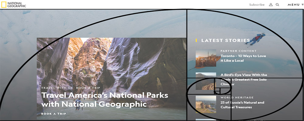 برای مثال در تصویر زیر وب سایت نشنال جئوگرافیک National Geographic را می بینید که چگونه به صورت کاملا عامدانه از این نسبت طلایی برای طراحی وب سایت استفاده شده و یک وب سایت شکیل، خوانا و با سازمان دهی خوب ایجاد شده است. این وب سایت در چشم بینندگان خود، حس طبیعی نظم، تعادل و سلسله مراتب را ایجاد میکند.